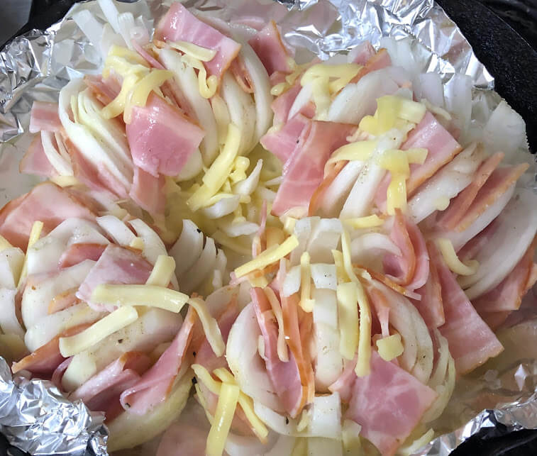 - 新玉ねぎとベーコンでチーズ蒸し焼き