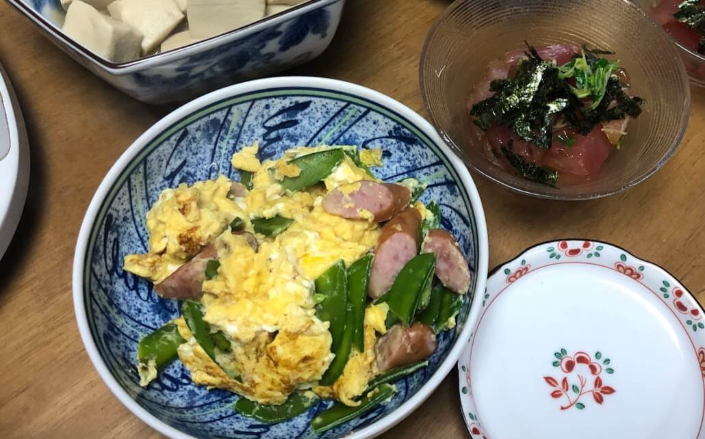 - キヌサヤとウインナーの卵とじ