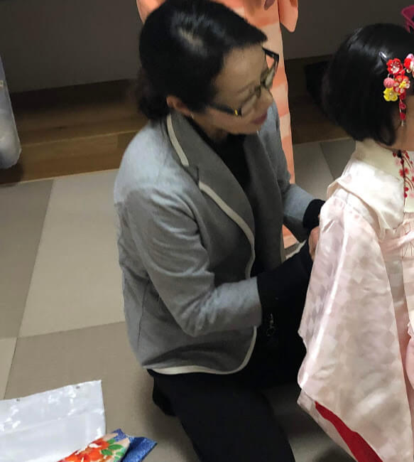 大人3人と3歳女児の着付け