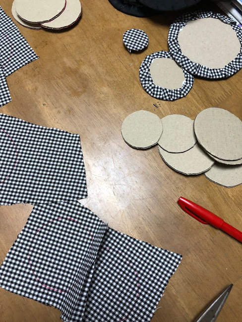 丸く切った布をボンドで貼り付けて行きます