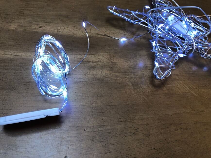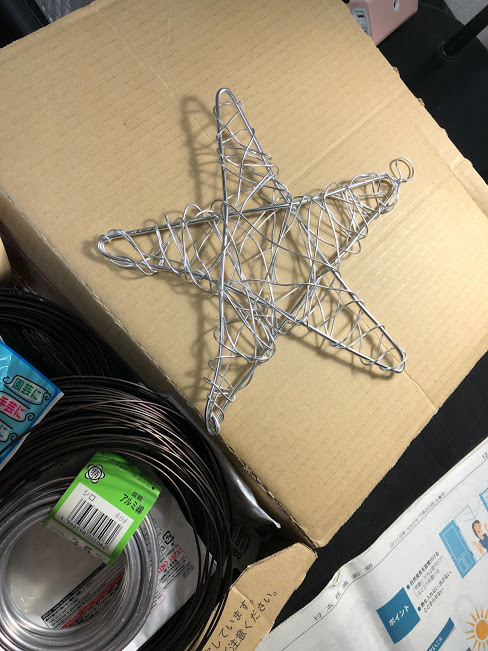 以前にワイヤークラフトをしたワイヤーが残ってるので、それを星がたにして、細いアルミワイヤーをランダムにぐるぐる♪
