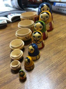 事務所の棚にはお人形がたくさん並んでます。お気に入りはマトリョーシカ。