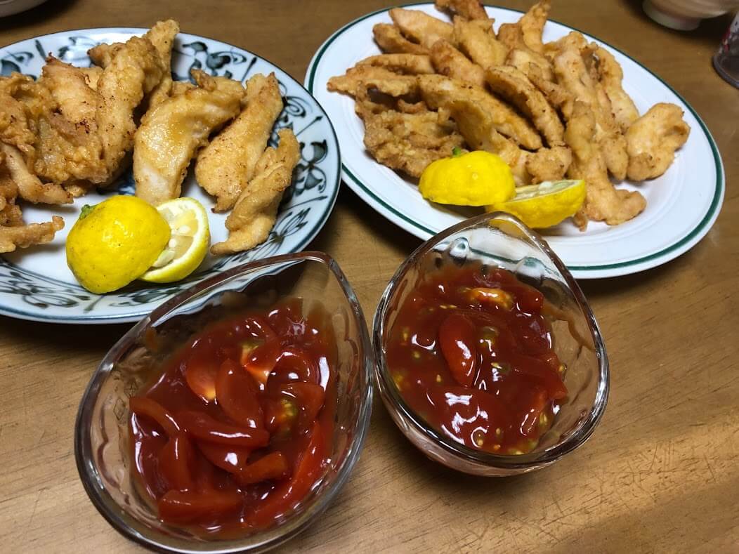 とり天は味付きでそのままでも美味しいけれど、ピヨ向けにサルサではなくケチャップを♪