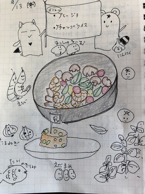 『9月13日(金曜日)エビいっぱ♪魚介のアヒージョとケチャップライス』
